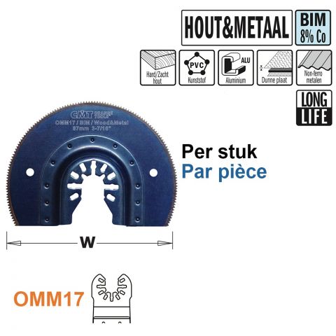 CMT 87 mm. ronde BIM multitoolzaagbladen voor hout en metaal, lange standtijd. (hard/zacht hout, kunststof, aluminium, dunne plaat, non-ferro metalen)