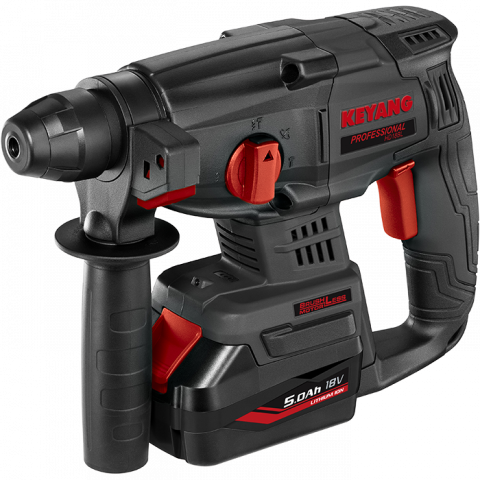Keyang’s nieuwste combihamer met een verstevigde body om zijn indrukwekkende kracht te kunnen beheersen. De koolborstelloze machine is voorzien van een 5,0 Ah accu om extra lang te kunnen werken. De accu is zo geplaatst dat de machine perfect in balans is. Schakel gemakkelijk tussen boren, klopboren en beitelen, of gebruik de vierde stand om beitels te roteren. Dankzij de handgreep is het mogelijk in bijzondere gevallen met slechts één hand te werken. Met led-verlichting en accuspanningsindicator.