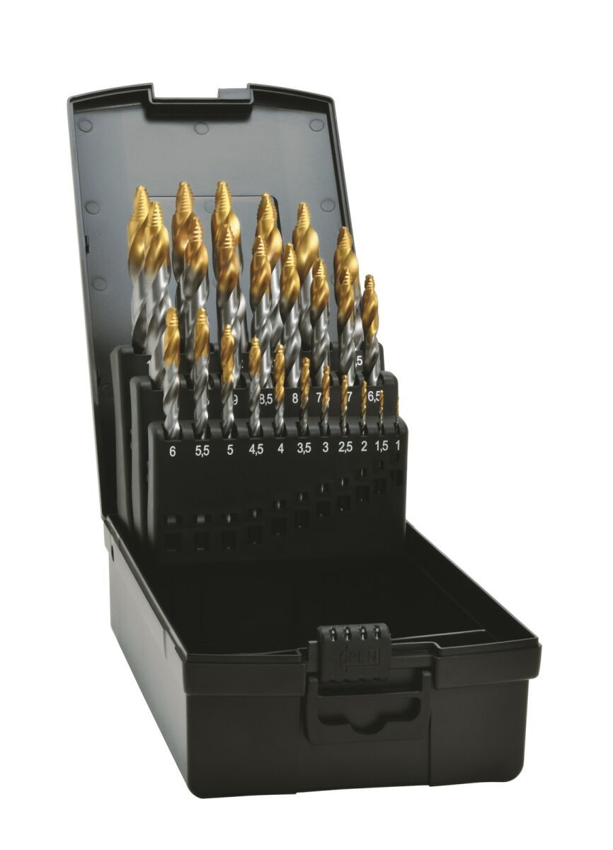 Een HSS DIN 338 ADVANCEDLINE spiraalborenset. Deze set bevat de speciaal ontwikkelde spiraalboren met de STEP-technologie. Met minimale inspanning zijn zuiver ronde gaten met braamvrije boorzijde mogelijk. De boren zijn voorzien van een 3-vlaks opname, 118° tophoek en een TiN-Tip coating.