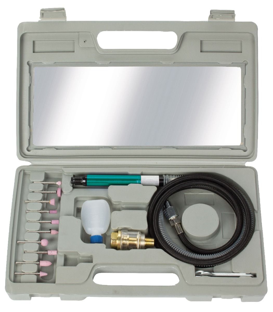 - 1 spantangen 3mm, 10 slijpstenen, inline oliër, aanspansleutels