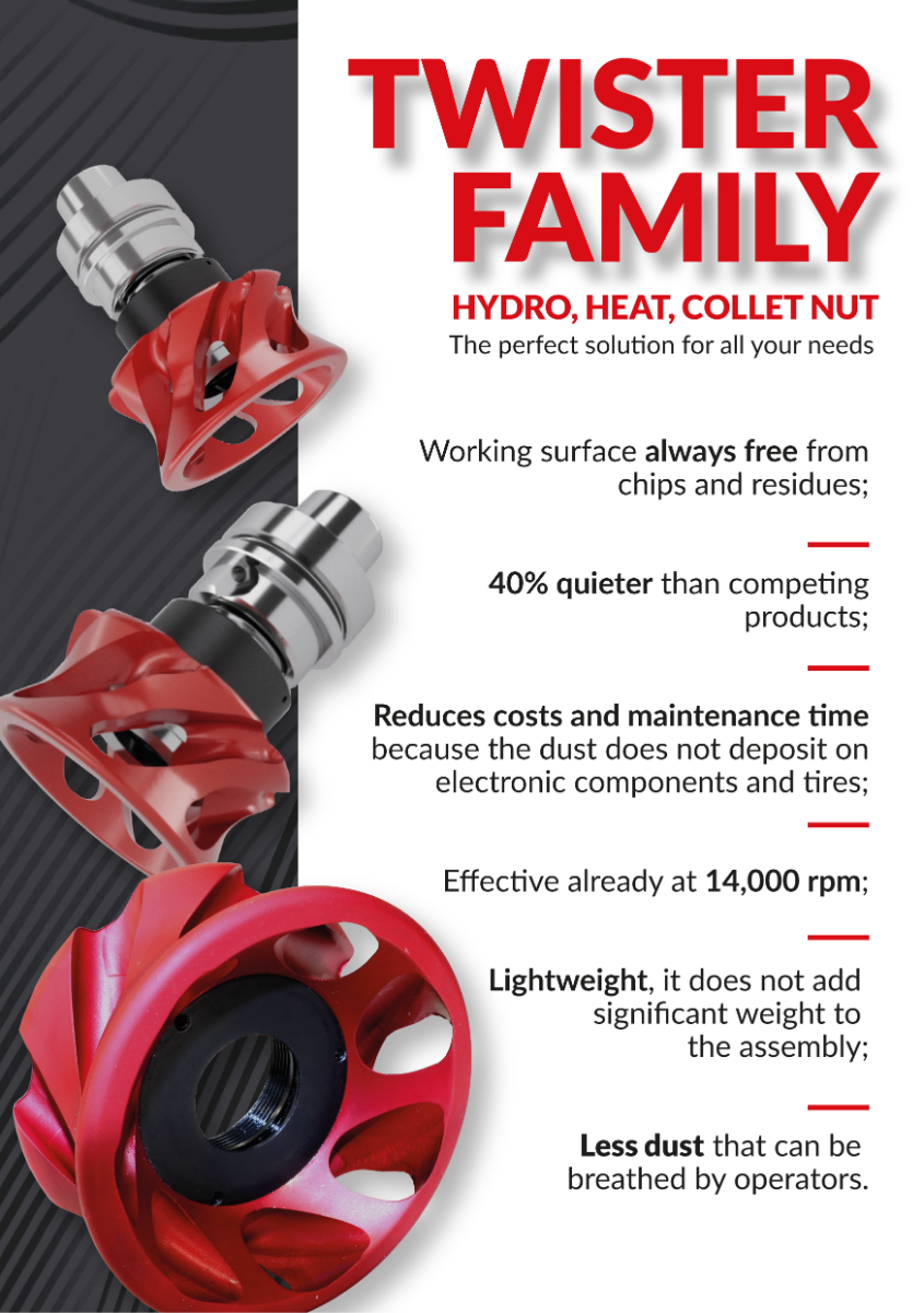 • Twister is zo ontworpen dat er geen stof ophoopt, waardoor de snede zuiver blijft. Het is echter een goede gewoonte om de Twister, de spantang en de gereedschapshouder na elk gebruik schoon te maken, om te voorkomen dat productieresten zich nestelen in de schroefdraad.