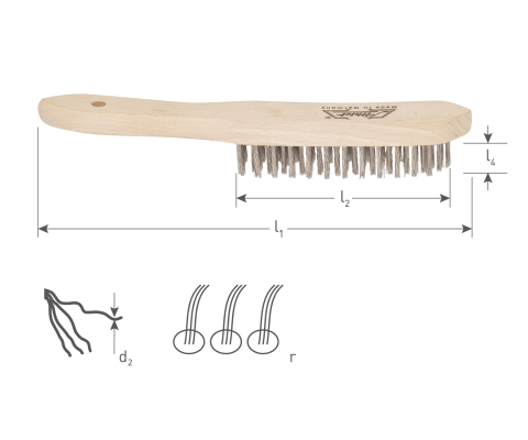 Houten handborstel voorzien van 0,3 mm roestvast kwaliteitsstaaldraad.