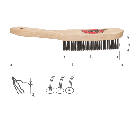 Houten lasnaadborstel voorzien van 0,35 mm gehard, glad kwaliteitsstaaldraad in V-vorm.
