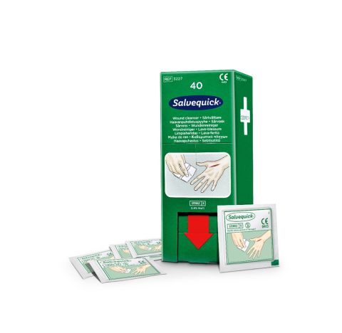 - 40 stuks Salvequick Wound Cleansers with 0.9% sodium chloride solution.