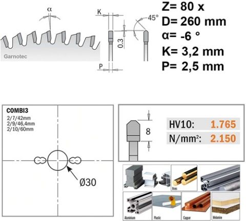 260x30x3,2 Z80*HW (hardmetalen tanden)* Aluminium, Composiet … *