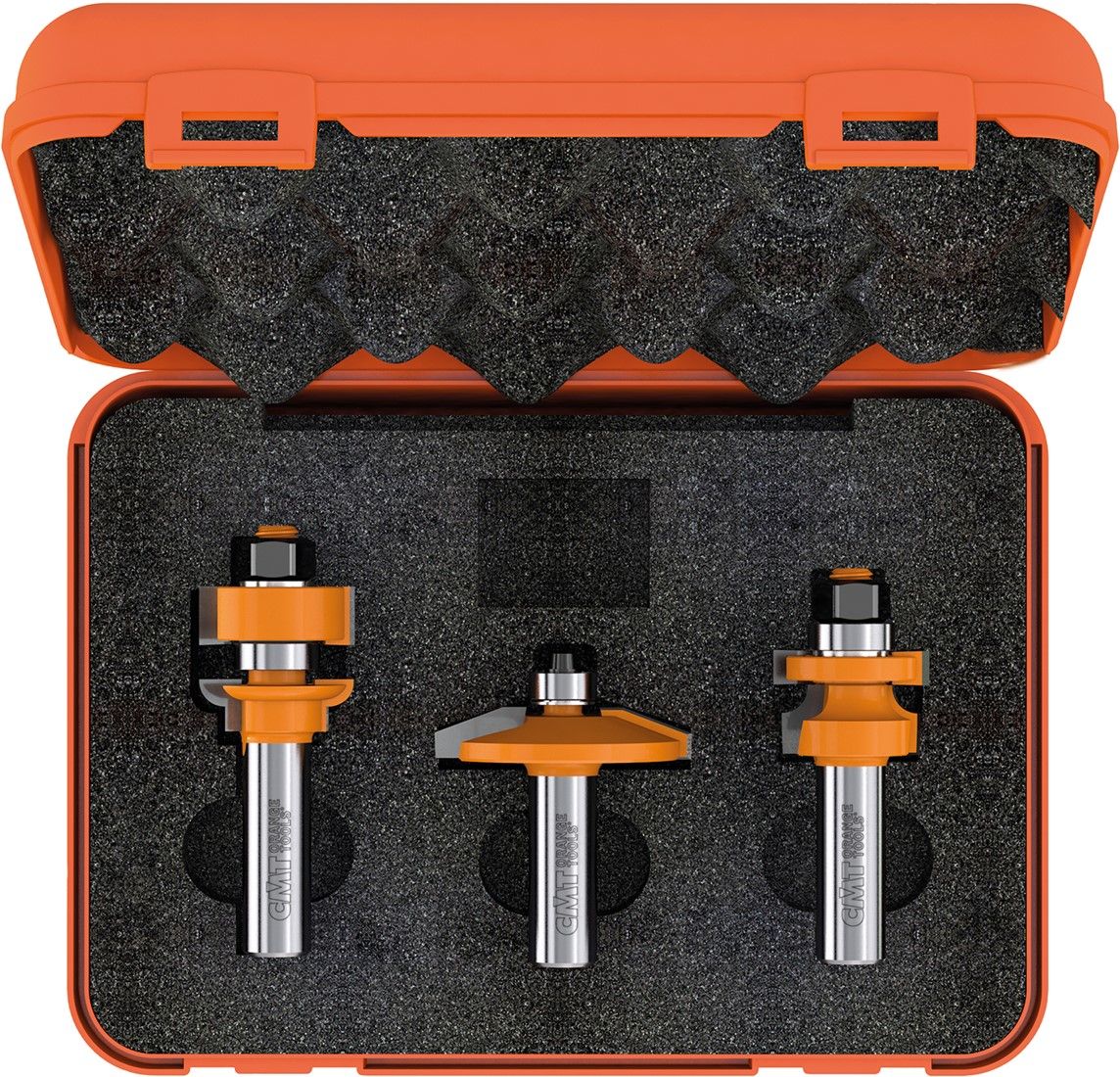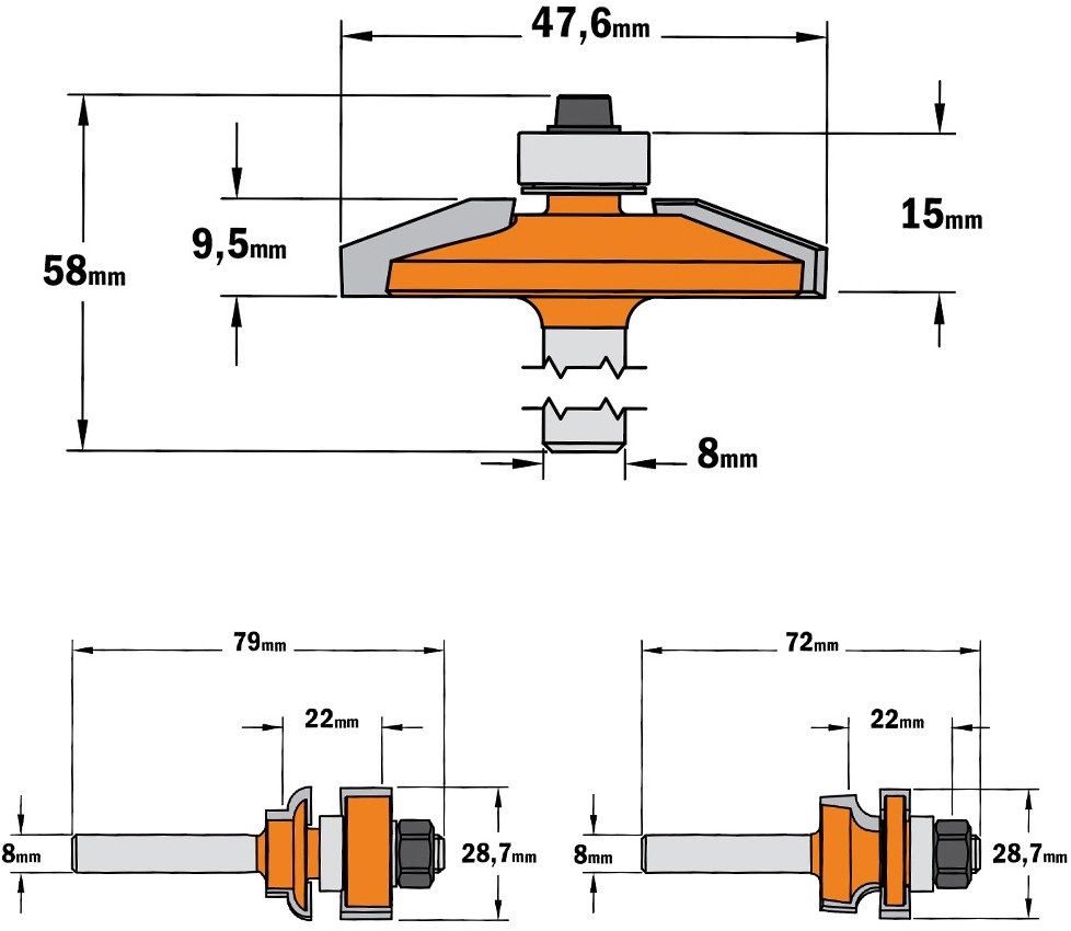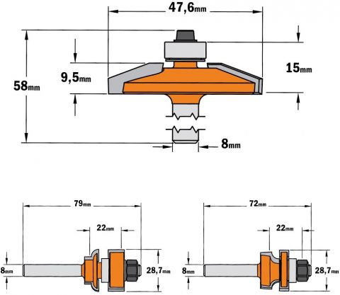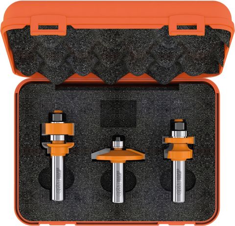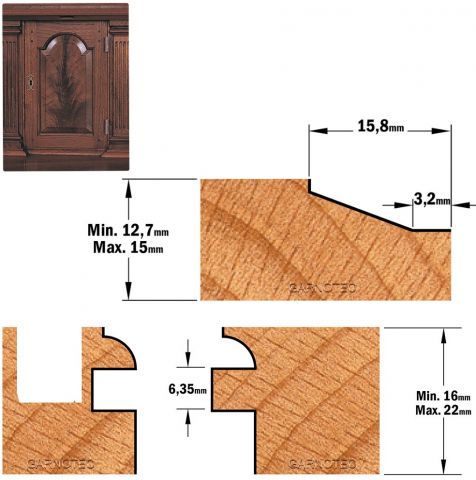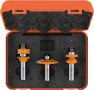 Deze driedelige freesset is ontworpen voor het maken van meubeldeuren met bescheiden afmetingen. Door de relatief kleine diameters van de afzonderlijke frezen, is deze freesset te gebruiken op handbovenfreesmachines met een kolf 8mm-aansluiting. Het gebruik van een freestafel wordt echter wel sterk aanbevolen. De set bestaat uit een profielfrees, een contra-profielfrees en een bossingpaneelfrees. De deurtjes kunnen in dikte variëren van 15,8 tot 22mm. De paneelfrees is bedoeld voor een paneeldikte van ongeveer 12,7mm. Alledrie de frezen zijn voorzien van geleidelagers, zodat ook het maken van toogdeuren zeer eenvoudig is.