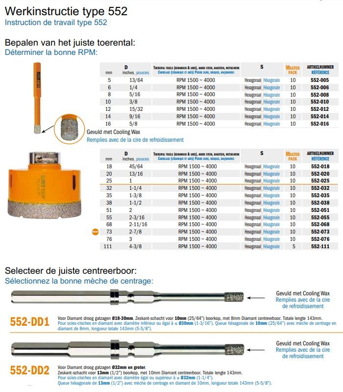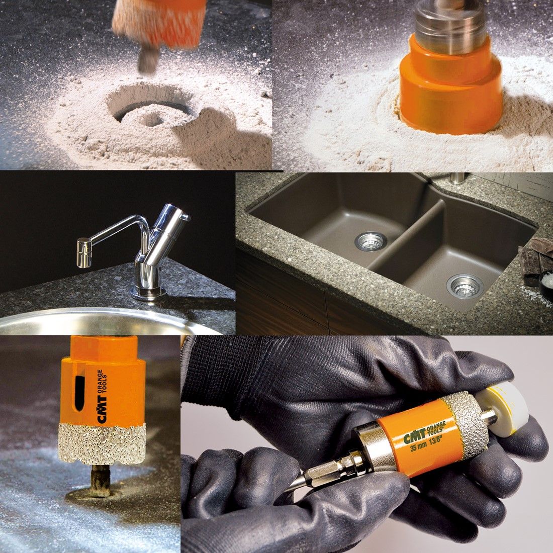 De CMT-gatzagen met een diamankorrel zijn speciaal ontwikkeld voor pro- fessionals die willen boren in extreem harde materialen zoals keramiektegels (porselein, gres, graniet, harde steen), glasvezelversterkte polyester, gipsplaat en Perspex. Deze gatzagen garanderen uitmuntende prestaties en superieure standtijden, zelfs bij het zagen in de allerhardste materialen (marmer, graniet, keramische tegels ...).