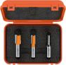 Deze groeffreessets zijn speciaal samengesteld voor het maken van groeven en verbindingen in multiplexplaten. De groeffrezen hebben de diameter die precies overeenkomt met de dikte van multiplexplaten, voor perfect passende verbindingen. Gebruik de groeffrees met diameter 18,2mm voor 19mm multiplex, de groeffrees met diameter 12,3mm voor 12,7mm multiplex en de groeffrees met diameter 6mm voor 6,35mm multiplex.