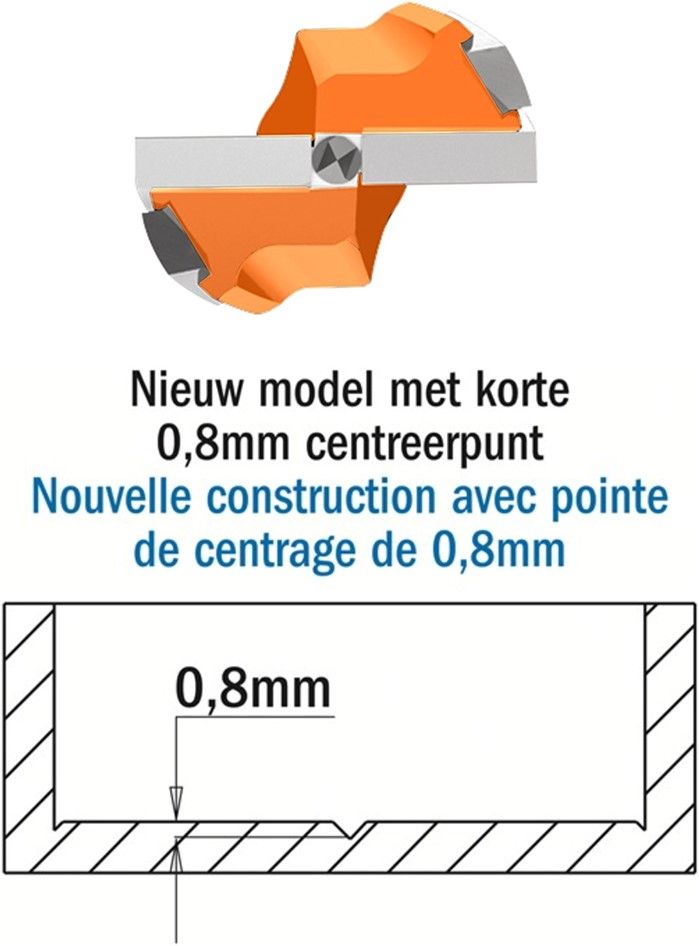 Toepassing: voor het splintervrij boren van blinde gaten in volhout, samengestelde houtsoorten, kunststoffen en al dan niet beplakte plaatmaterialen. Ideaal voor het boren van scharniergaten. De korte centreerpunt en voorsnijders maken deze boren ook geschikt voor dunne platen.