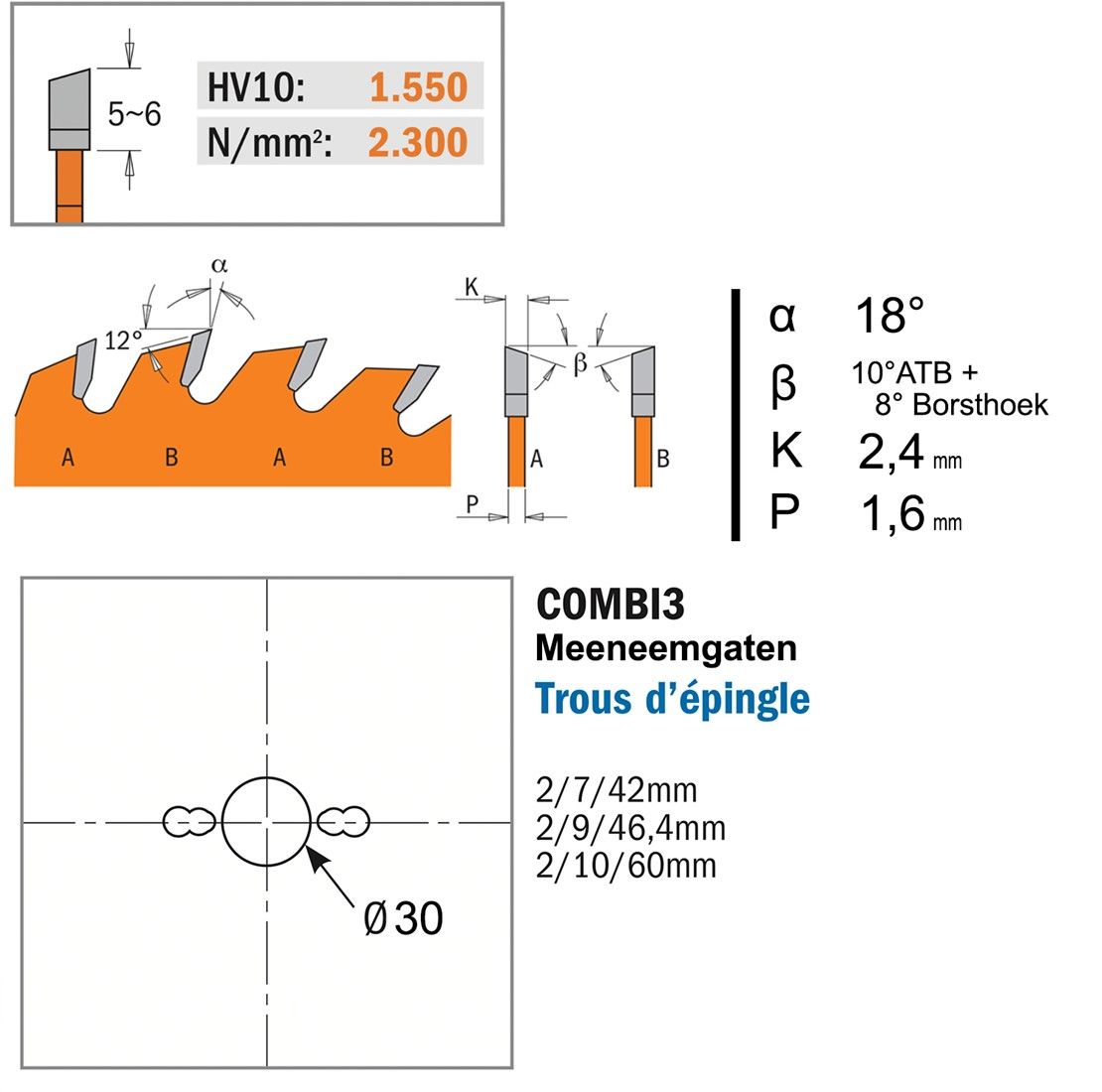 CMT afkort HM zaagblad Ø250mm met 42 tanden. Met combi3 meeneemgaten