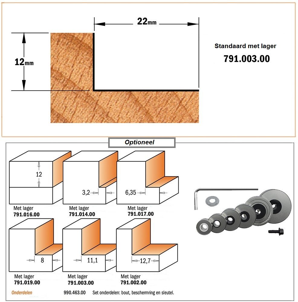 Standaard geleverd met lager 791.003.00 voor een sponningdiepte van 22,2 mm.