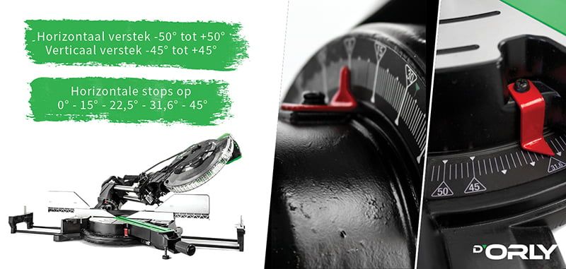 - Verder kan deze D’Orly MS3310LRL Radiaal Afkortzaag 305mm als enige in het verticale vlak, zowel naar links als naar rechts, van -45 tot +45° gekanteld worden. Zo is het zagen van dubbel verstek wel erg gemakkelijk geworden. Hiertoe is de motor schuin in de behuizing geplaatst, hetgeen bewijst hoezeer er over deze machine is nagedacht.