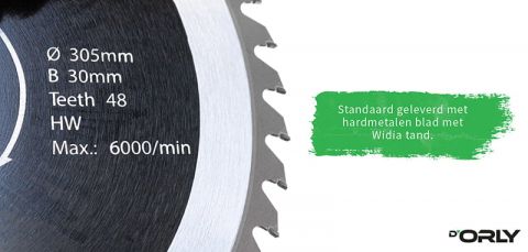 - De 2000 Watt motor doorklieft met gemak de hardste houtsoorten, mede dankzij het meegeleverde 305 mm 48 tands zaagblad met Widia tanden.