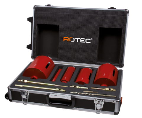 Diamantborenset voor gebruik zonder waterkoeling. Standaard met M16-binnendraad. Met de bijgeleverde verlengstukken is de nuttige boordiepte de verlengen tot 300mm. Geleverd incl. accessoires in een handige trolley.