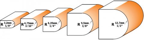 Elke halfronde frees, van de diameter van 22,2 mm tot de frees van 28,6 mm, is uitgerust met snijkoppen in mikrokorrel hardmetaal, profiel ontworpen om de terugslag te voorkomen, bedekt met fluorcarbide PTFE hars in oranje kleur.
