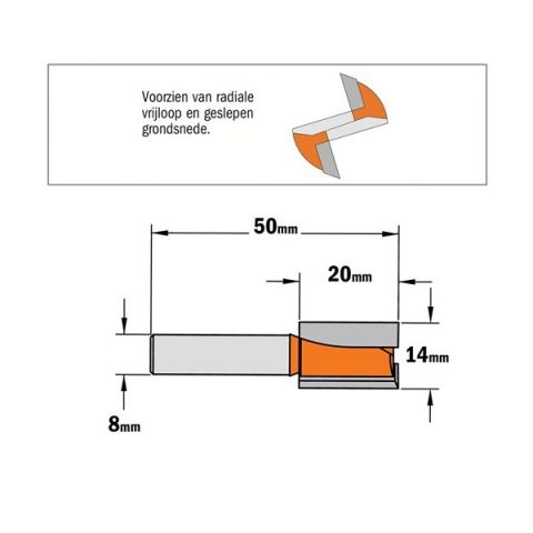 CMT groeffrees Ø14x20/50mm. Z=2 S=Ø8