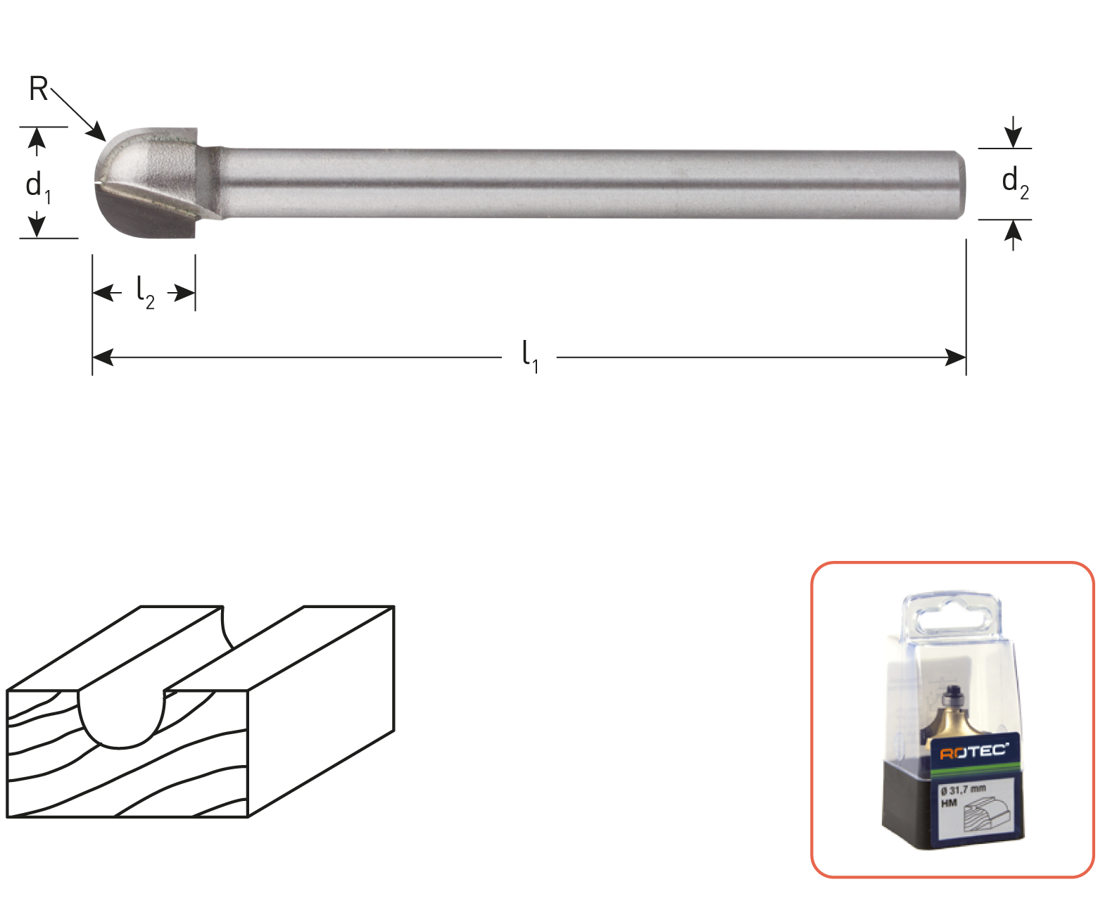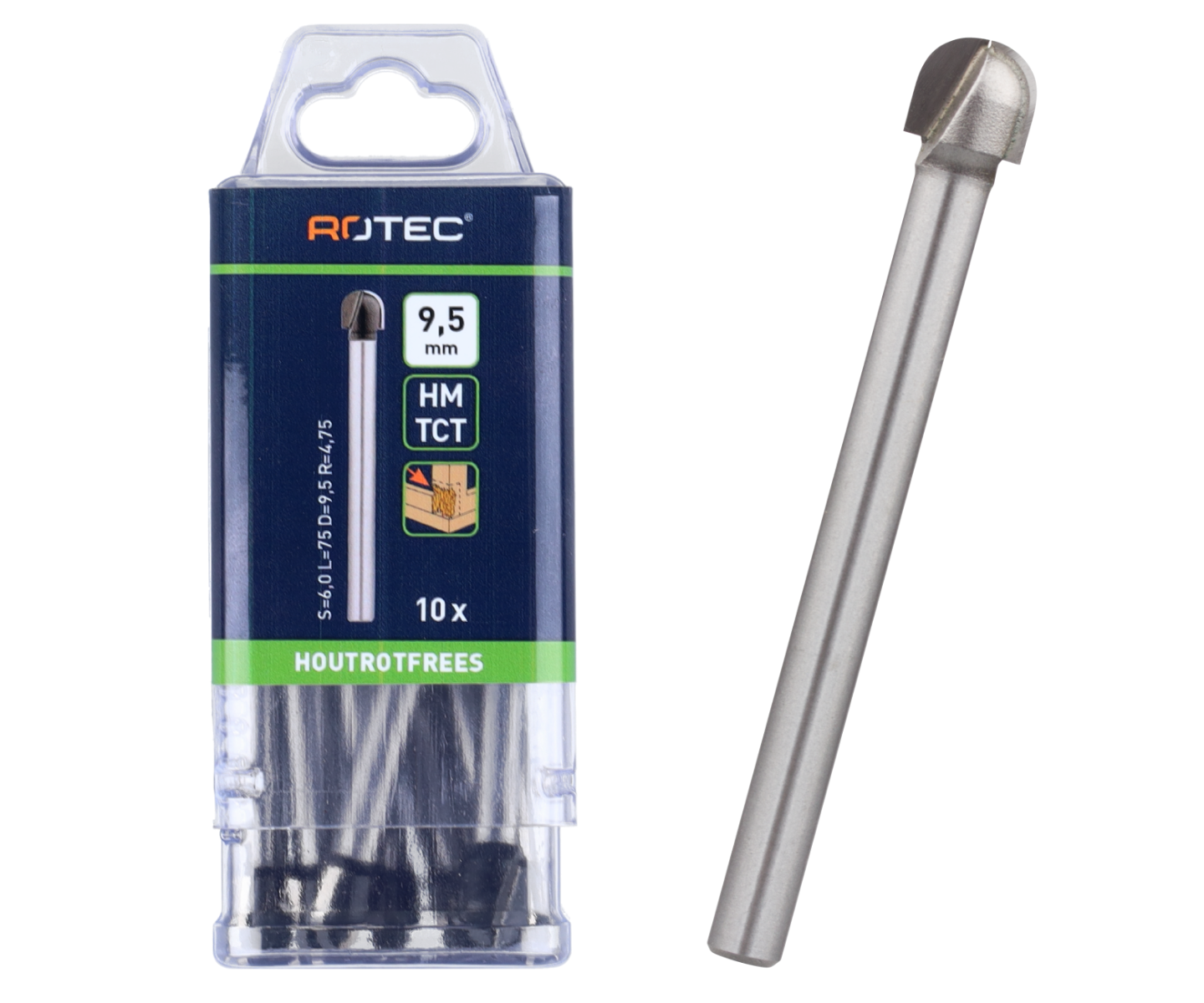 Rotec houtrotfrees Ø 9,5 x 8 / 75 mm. R=4,75 > box 10 stuks