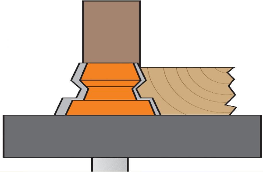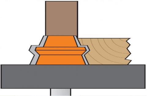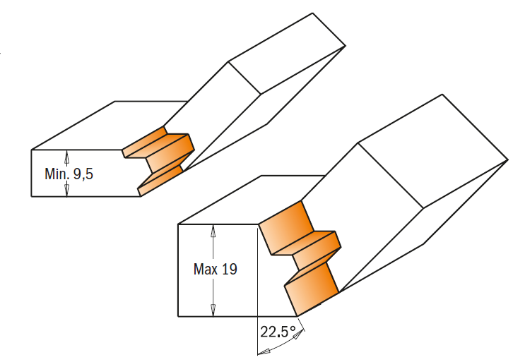 Niet meer tobben met lijmklemmen bij 22,5° verbindingen. Gebruik deze freesset om achtkantige werkstukken te maken. De 22.5° verstekverlijmset zorgt voor een strakke en zeer sterke verbinding. De noodzaak om een lamellenverbinding te gebruiken vervalt. De twee frezen uit deze CMT-set zijn perfect op elkaar afgestemd. Het gebruik is eenvoudig. De hoogte-instelling van de frezen is niet bijzonder kritisch. Stel uw geleidingsplaten van uw freestafel af op de wijze zoals afgebeeld in onderstaande tekening. Breng na het frezen lijm op het hout en klem de delen tegen elkaar door middel van een simpele spanband.