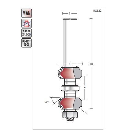 Frees voor het tweezijdig fasen van materialen met dikten variërend van 11 tot 22mm. De frees kan door middel van de meegeleverde afstandsringen worden aangepast aan de dikte. Door uitwisseling/omdraaien van de frezende delen is ook een dubbel-afrondprofiel mogelijk. Omtreksnijdend. Rechtsdraaiend.