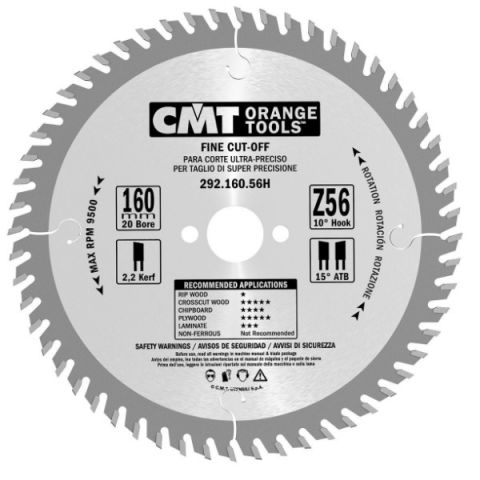 Hardmetalen zaagblad van CMT Ø 160 z=56 Wisseltand, voor het splintervrij afkorten en zagen van triplex, multiplex, hard- en zachthout en MDF. Hoe fijner de vertanding des te fijner de zaagsnede.