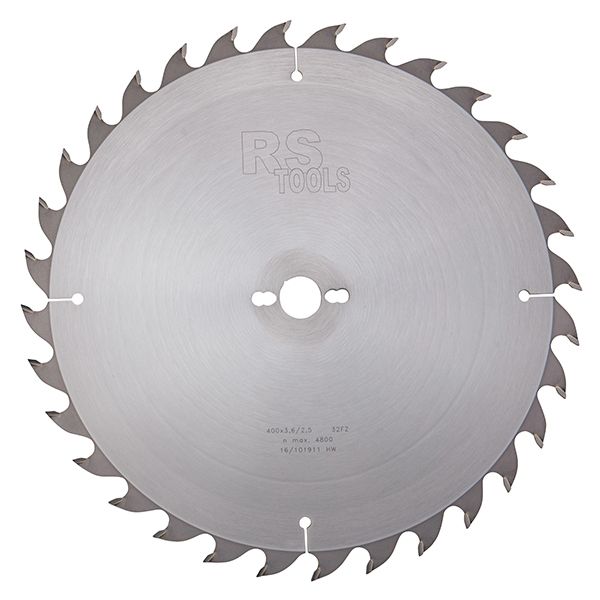 Hardmetalen zaagblad van RS Tools Ø 400 z= 32 Vlaktand. Van hoge Duitse kwaliteit!, voor het zagen van massief zacht of hard hout in de lengte/vezelrichting. Geeft een vrij grove zaagsnede en grote spaan. Voordelige zaag voor het afkorten/schulpen van veel voorkomende materialen.