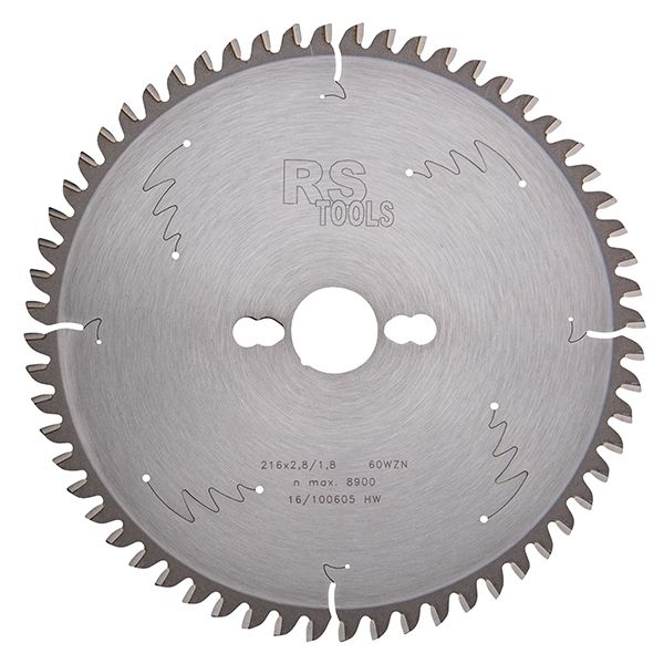 Hardmetalen zaagblad van RS Tools Ø 216 z=60 Wisseltand Negatief. Van hoge Duitse kwaliteit!, voor het splintervrij afkorten en zagen van triplex en spaanplaat, met namen voor kapzagen en pendelzagen.