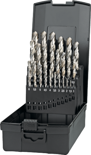 DIN 338, blank geslepen uitvoering, met kruisaanslijping vanaf 3,0 mm, in kunststof cassette, gevuld met boren uit artikelgroep 11.423