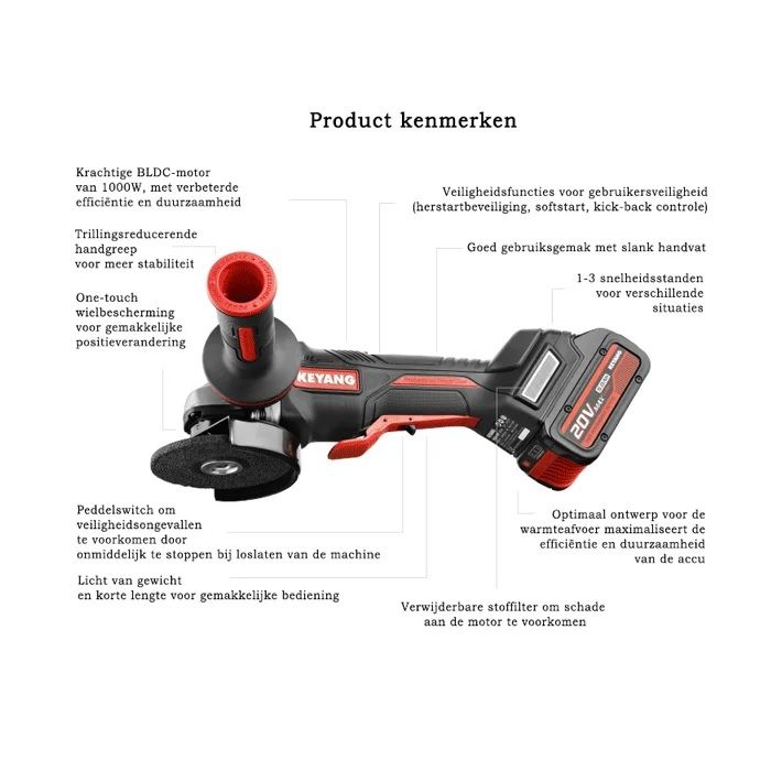 Om in te spelen op de wereldwijde trends in arbeidsveiligheid heeft Keyang een 2-Step paddle switch voor accu haakse slijpmachines ontwikkeld. Dit type schakelaar voldoet aan de verhoogde eisen van veiligheid op een steeds groeiend aantal werkplekken. Door het ontwerp is het zeer onwaarschijnlijk dat de machine aangaat zonder dat dit de bedoeling is en schakelt hij daarbij ook meteen uit wanneer de schakelaar wordt losgelaten. Krachtige prestaties op accu te vergelijken met een 1000W gesnoerde slijper.