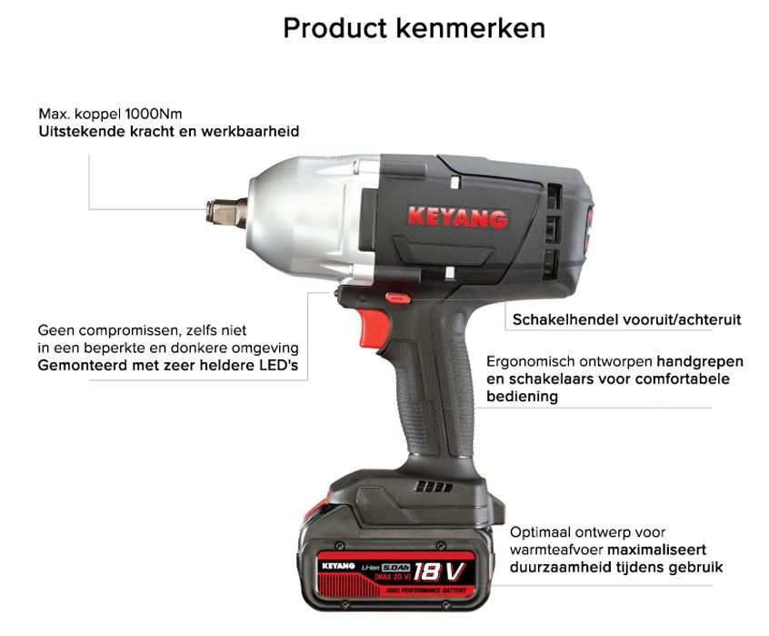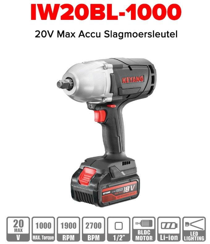 Kenmerken Keyang IW20BL Accu slagmoersleutel – 18V – 5.0Ah