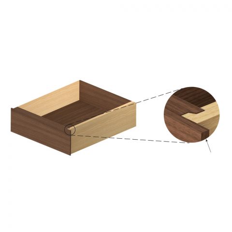 De kwaliteit van een lade wordt onder andere bepaald door de constructie. Met behulp van de CMTladefrontfrees wordt de constructie solide, sterk en uiterst nauwkeurig. Zoals hieronder wordt aangegeven freest u het ladefront eerst met de binnenzijde op het freestafelblad. Vervolgens wordt de zijkant van de lade staand langs de freesgeleider gevoerd.
