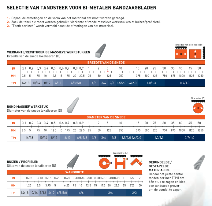Afhankelijk van hoe je het metaal wilt zagen met de lintzaag, hebben wij een aantal tips. Als je vooral bochten wilt zagen dan adviseren wij een smalle dunne lintzaag. Wil je vooral een stabiele rechte zaagsnede? Kies dan voor een hoge en brede lintzaag. Ook de vertanding speelt een belangrijke rol bij het zagen met een lintzaag. De spaanhoek verschilt per te bewerken metaalsoort, als je een zwaardere staalsoort wilt zagen heb je een agressieve vertanding nodig om door het materiaal heen te komen. Onze tanden per inch (TPI) kun je per lintzaag vinden onder meer informatie. Twijfel je nog over welke vertanding voor jouw werkstuk of welke lintzaag het beste voor jou is? Een niet passend zaaglint kan ernstige ongelukken veroorzaken en je project ruïneren. Neem contact met ons op en wij adviseren je hier graag over.