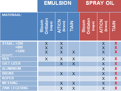 TiAlN: coating om vol materiaal te zagen met olienevel. Kan niet worden gebruikt voor zachte stalen met een overvloed aan koelvloeistof.