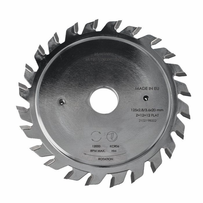 Voor spanvrij voorritsen van gelamineerde panelen. Om de kwaliteit van de randen van het te zagen materiaal te verzekeren. Met vulringen te gebruiken om zo de tandbreedte bij te stellen.