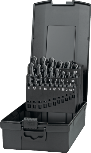 DIN 1897, extra korte geslepen uitvoering, met kruisaanslijping vanaf 1,6 mm, in kunststof cassette, gevuld met boren uit artikelgroep 11.130