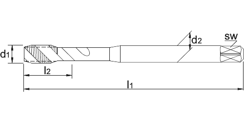 DIN 371 en DIN 376, 60°, verdikte schacht, spiraalhoek 40°, voor blinde gaten, aansnijding 2,5 gangen, snijlengte 10 gangen teruglopend naar de 5e gang