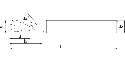 Nano-Grain VolHardMetaal, met precisie volradius, HSC hoge snelheidsfrees, verjongde schacht (nek), gladde cil. schacht, tolerantie t/m 6 mm = ± 0,005 mm, tolerantie t/m 12 mm = ± 0,01 mm, van 45 HRc tot 70 HRc