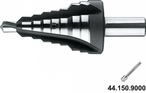 met drievlaks schacht, met vier snijkanten en verwisselbare centreerboor, voor het gelijktijdig boren en ontbramen van gaten in plaat 4-6 mm dik