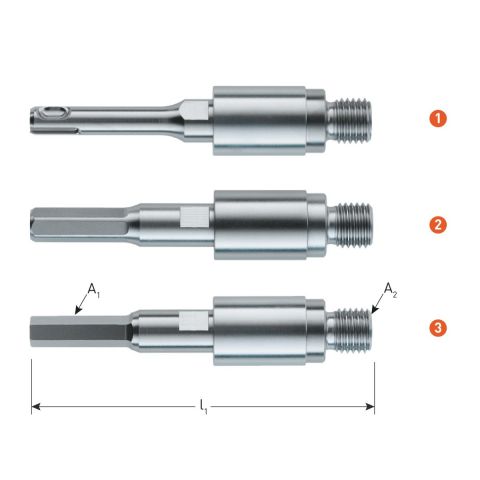 PROTect snelspan-adapter. Leverbaar met 6-kant en SDS+ schacht. Snel wisselen van centreerboor en/of het uithalen van de boorkern. Geen gevaarlijk ronddraaiende stelschroef meer vanwege snelspansysteem.