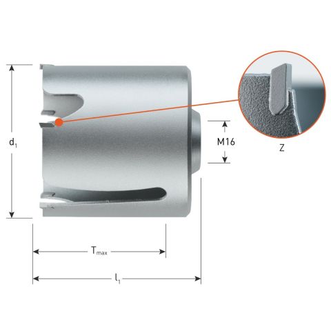 Universele gatzaag met robuust ontwerp voor een lange levensduur. De hardmetalen tanden worden aan twee zijden ondersteund en zitten muurvast dankzij vergrote soldeervlakken. Snel werken door de op uiniverseel gebruik afgestemde, agressieve snijkanten. Comfortabel werken door het vibratie-arme ontwerp. Max. boordiepte 60mm, opname M16 binnendraad.