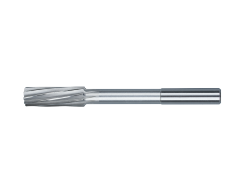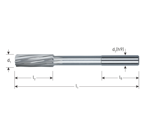 UitvoeringHSS-E machineruimer DIN 212D met cilindrische schacht, 10° linkse spiraalgroeven, rechtssnijdend, tolerantie H7.