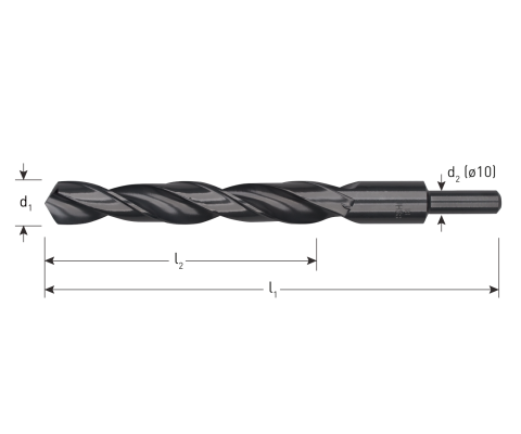 UitvoeringHSS-R Spiraalboor DIN 338, kort, type N, rolgewalste uitvoering, stoomontlaten, tophoek 118°, schacht afgedraaid naar ø10.
