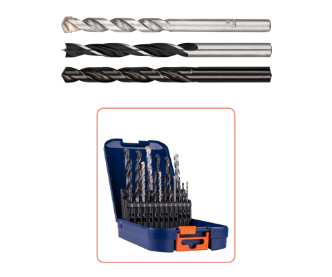 Set met spiraalboren voor metaal (type '100'), hout (type '235') en steen (type '225') in handige cassette uit slagvast ABS.