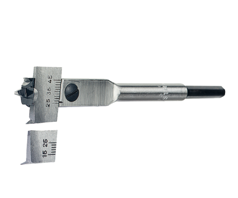 Verstelbaar, alle delen gehard, volledig gepolijst, 2 uitwisselbare messen. Voorzien van 3-kant schacht om slippen in de boorkop te voorkomen.