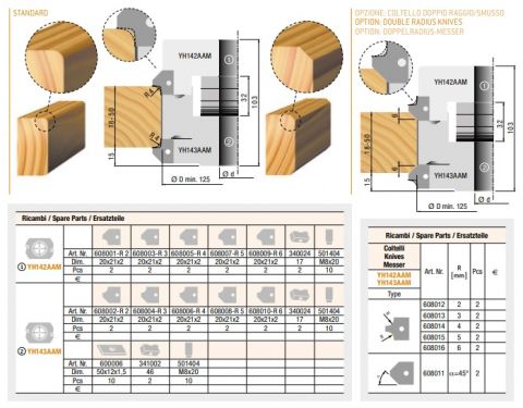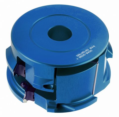 Freesset bestaande uit twee elementen in aluminium uitvoering, standaard hardmetaal omkeerbaar messen, voor zeer nauwkeurig schaven en afschuinen/afronden in één enkele bewerking, verstelbaar voor het frezen van massief hout en alle soorten plaatmateriaal van 18-50 mm dikte (inclusief afstandsringen),