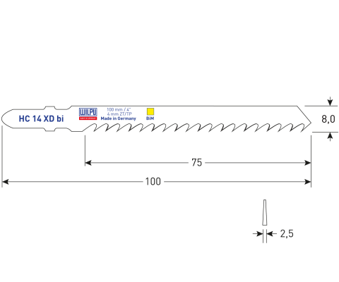 Extra dik Bi-metalen zaagblad voor rechte zaagsneden in hout tot 50mm, tevens geschikt voor bochtenwerk in dik materiaal.