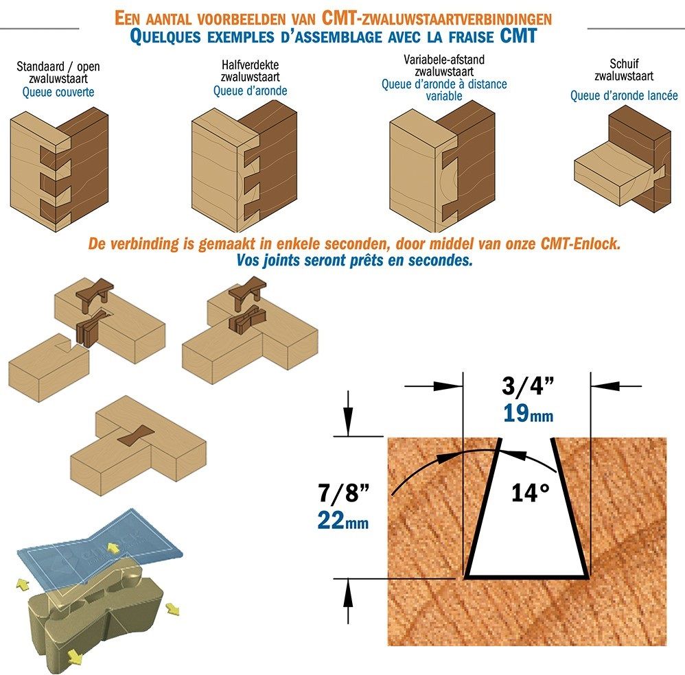 Voor het maken van verbindingen adviseren we het gebruik van het CMT universele verbindingssysteem type CMT300, waarmee alle soorten zwaluwstaartverbindingen en diverse tandverbindingen eenvoudig te maken zijn.