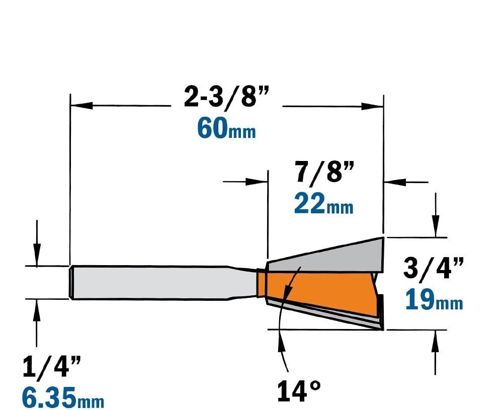 CMT zwaluwstaartfrees, D=19, I=22, L=60.3, Z2, 14°, S=Ø6.35, HW